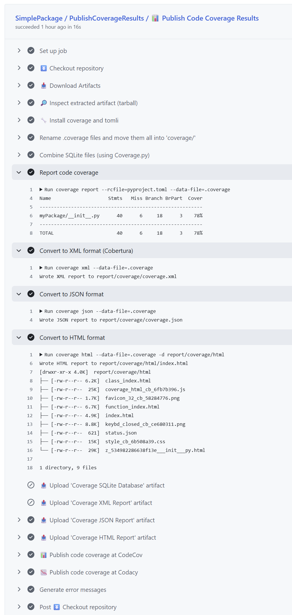 formats like Cobertura XML, JSON or HTML. These outputs are either uploaded as a new artifact or can be published to